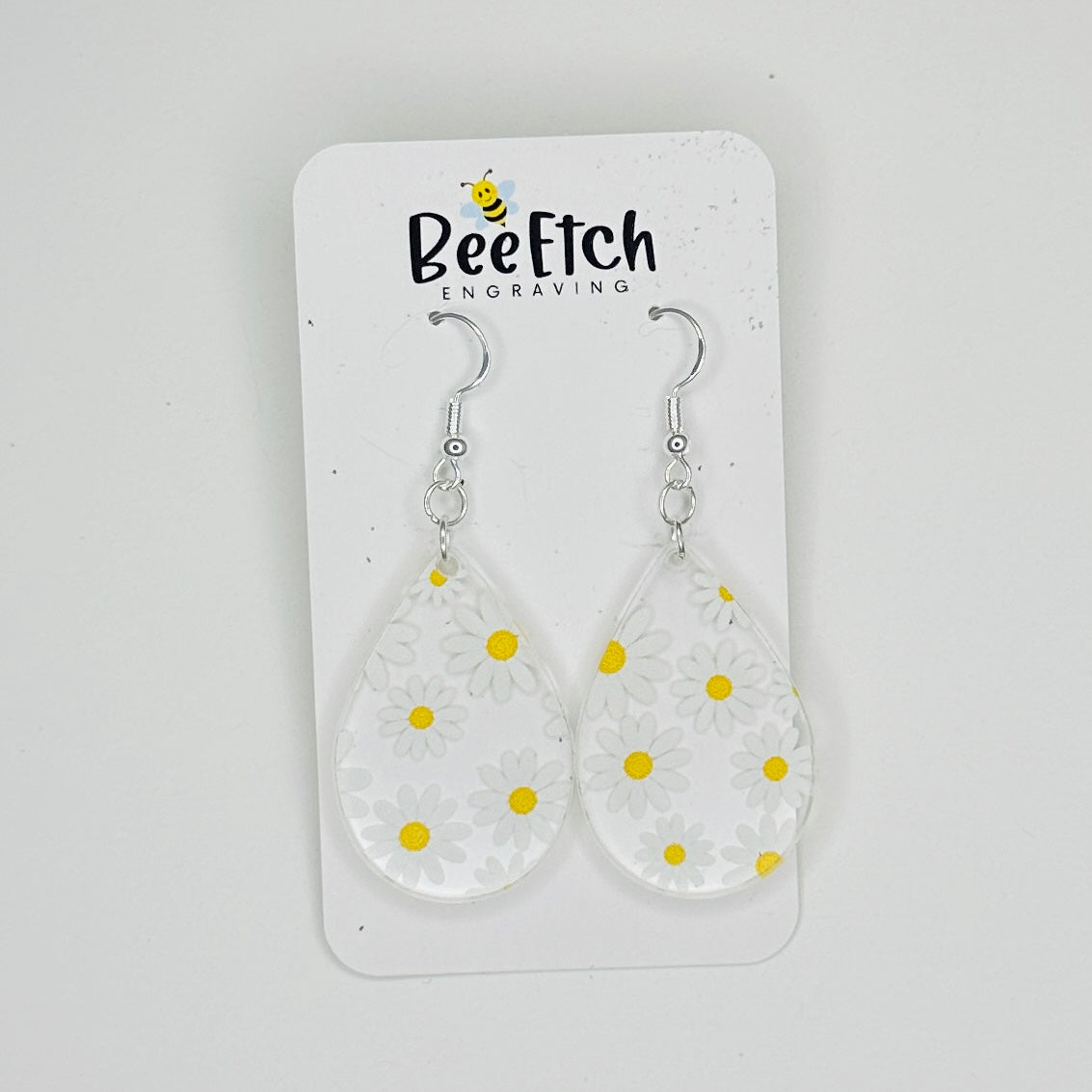 Add a touch of whimsy to your look with our Field of Daisies Katie Teardrop Dangle Earrings. The scattered daisies, in varying sizes, on clear acrylic make for a bold design that stands out, especially on dark hair. These playful earrings are perfect for anyone looking to add a fun and unique element to their style.